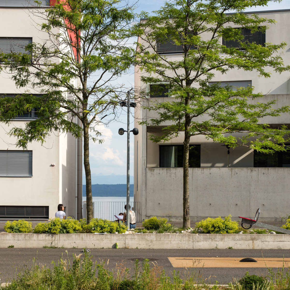 Le projet: il s’agit d’un programme de 485 logements pour 1200 habitants, dont le plan a été validé en 2011. Les projets d’habitat développés sont très divers par leur taille (du 2,5 pièces au 6,5 pièces), leur typologie (duplex, attiques, rez-de-jardin, terrasses, loggias), leur équipement (cloisons modulaires, domotique, etc.) et leur disponibilité (locations, appartements en PPE), de manière à favoriser la mixité sociale et intergénérationnelle. De nombreux aspects environnementaux ont été pris en compte. Dans les espaces publics, des espèces indigènes ont par exemple été plantées pour favoriser la biodiversité. De plus, la totalité des eaux de pluie est réinfiltrée. Les toits des immeubles sont végétalisés et conçus pour retenir l’eau de pluie avant de la diriger vers les dispositifs de réinfiltration dans le terrain, réalisés sous forme d’un important réseau de noues, (dépressions peu profondes).