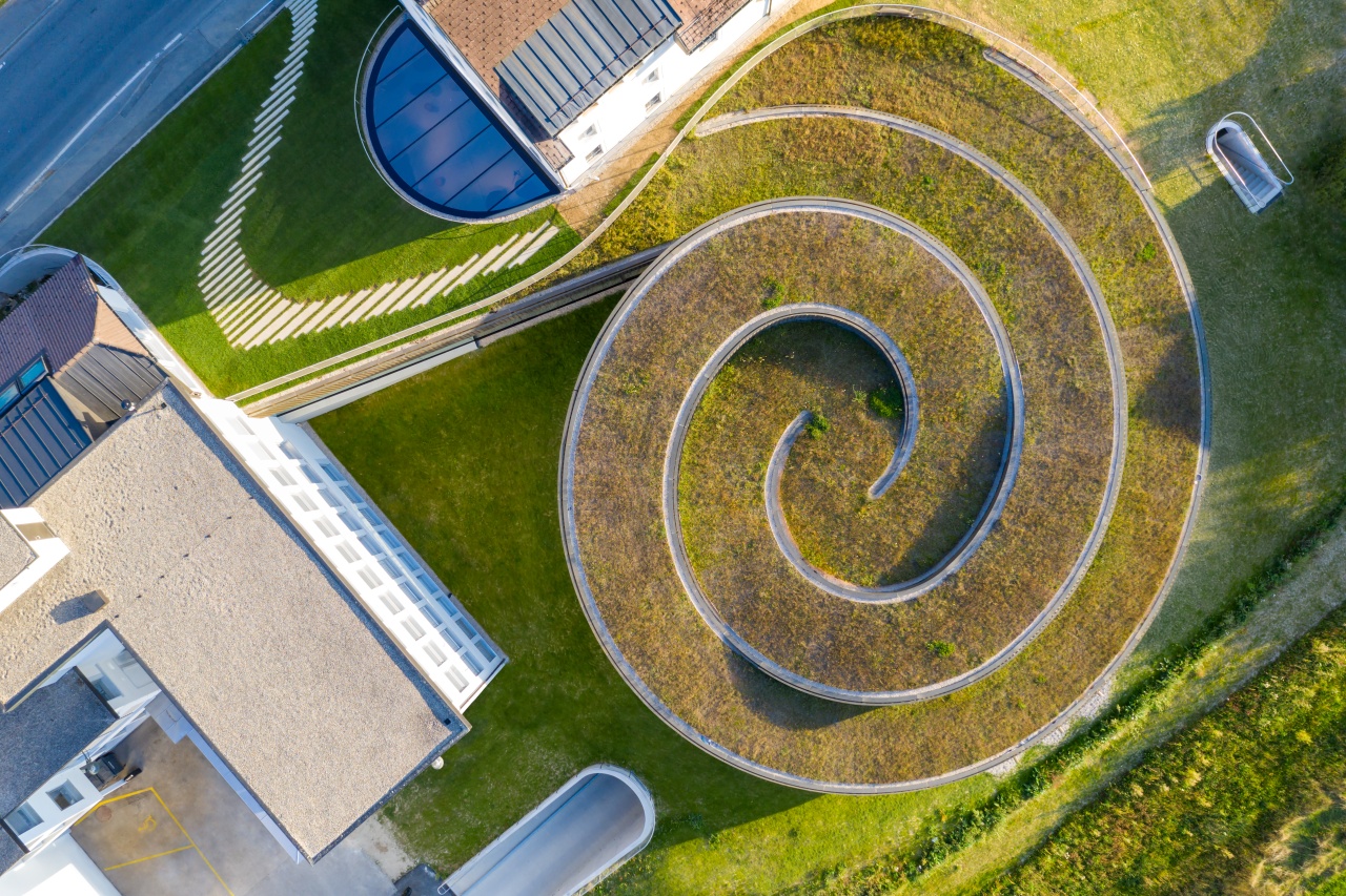 Une prouesse d’ingénierie et de design. Il s’agit d’une première mondiale à cette altitude. La toiture métallique est entièrement portée par les murs de verres incurvés, composés de 3 à 7 couches de vitrage porteur «float» qui limitent les distorsions du verre. Bien que très simple en apparence, la construction a dû faire face à de nombreux défis techniques, de la gestion du chantier à l’installation très précise des panneaux de verre, et à l’écoulement des eaux depuis le centre de la spirale, point le plus bas de la toiture.
