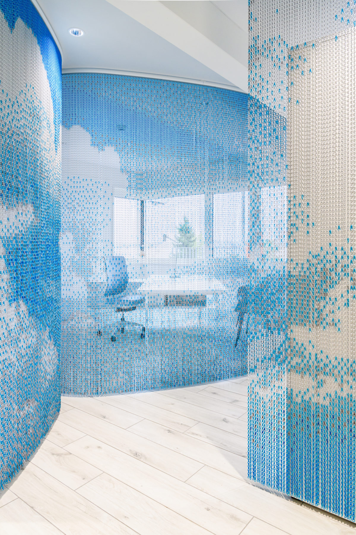 Source: © Patrice Schreyer / Droits d'utilisation uniquement pour Jorge Canete/ Parution Projects 2020Dans les bureaux, des photographies de nuages ont été imprimées sur les rideaux métalliques qui séparent tout en douceur les différentes zones des bureaux. Ces séparations tout en courbes douces apportent une sérénité et une dimension onirique à l’atmosphère.