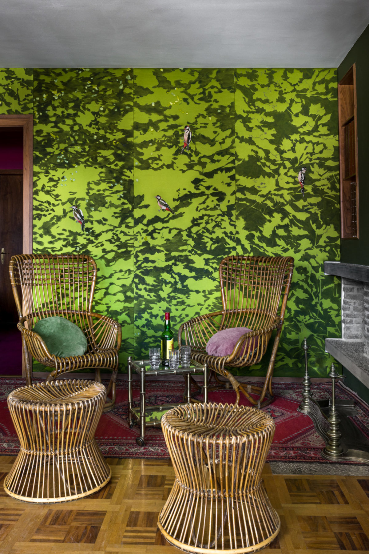 Au-dessus de la cheminée, portrait de la grand-tante de la propriétaire. Fauteuils 50 en osier Tito Agnoli.