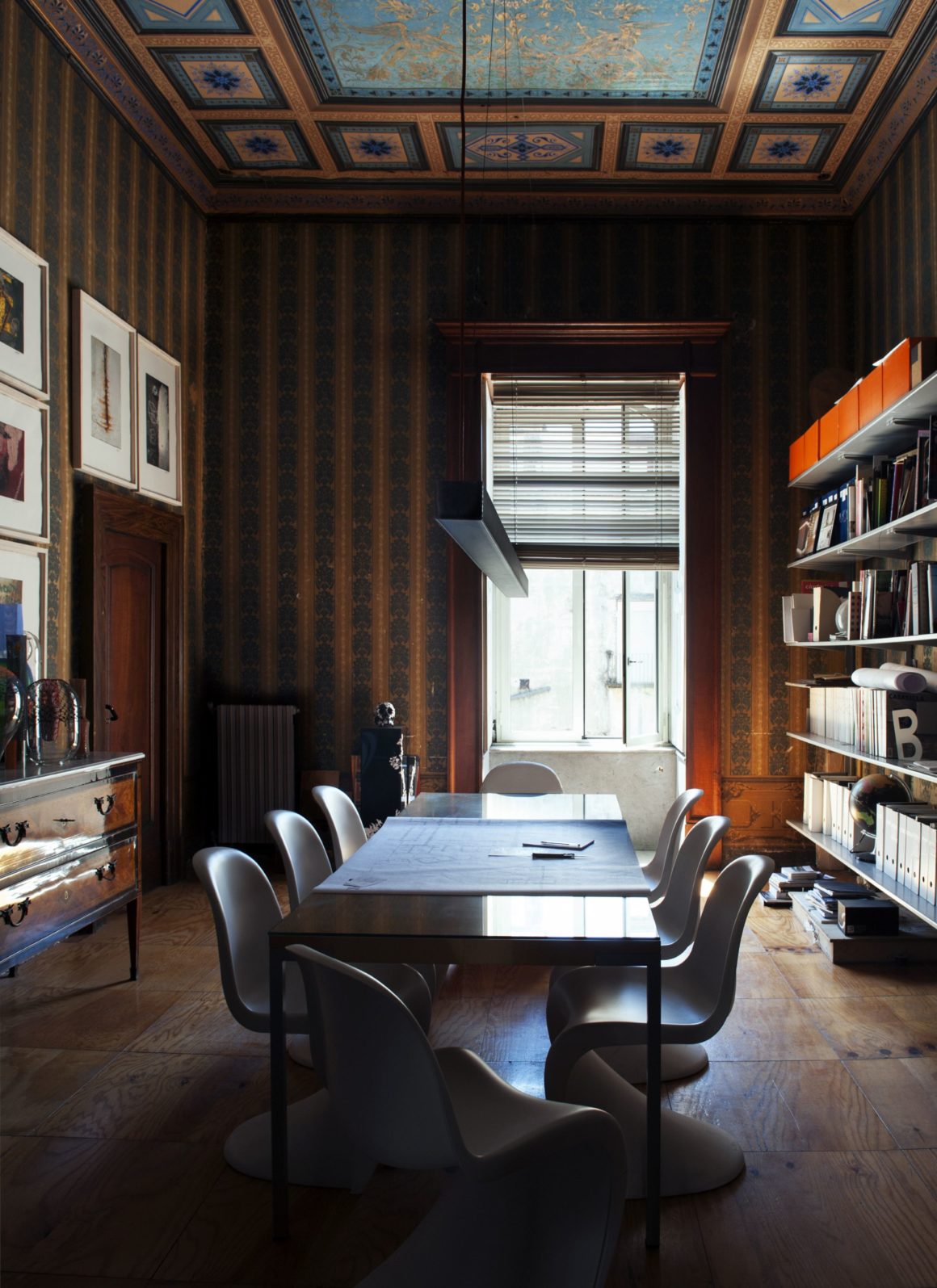 La salle de réunion avec ses fresques sur papier d’époque. Autour de la table Pallucco, chaises Verner Panton. Lampe Erco. Bibliothèque murale Pallucco Italia. Sculpture «Skull» d’Anna Fusco.