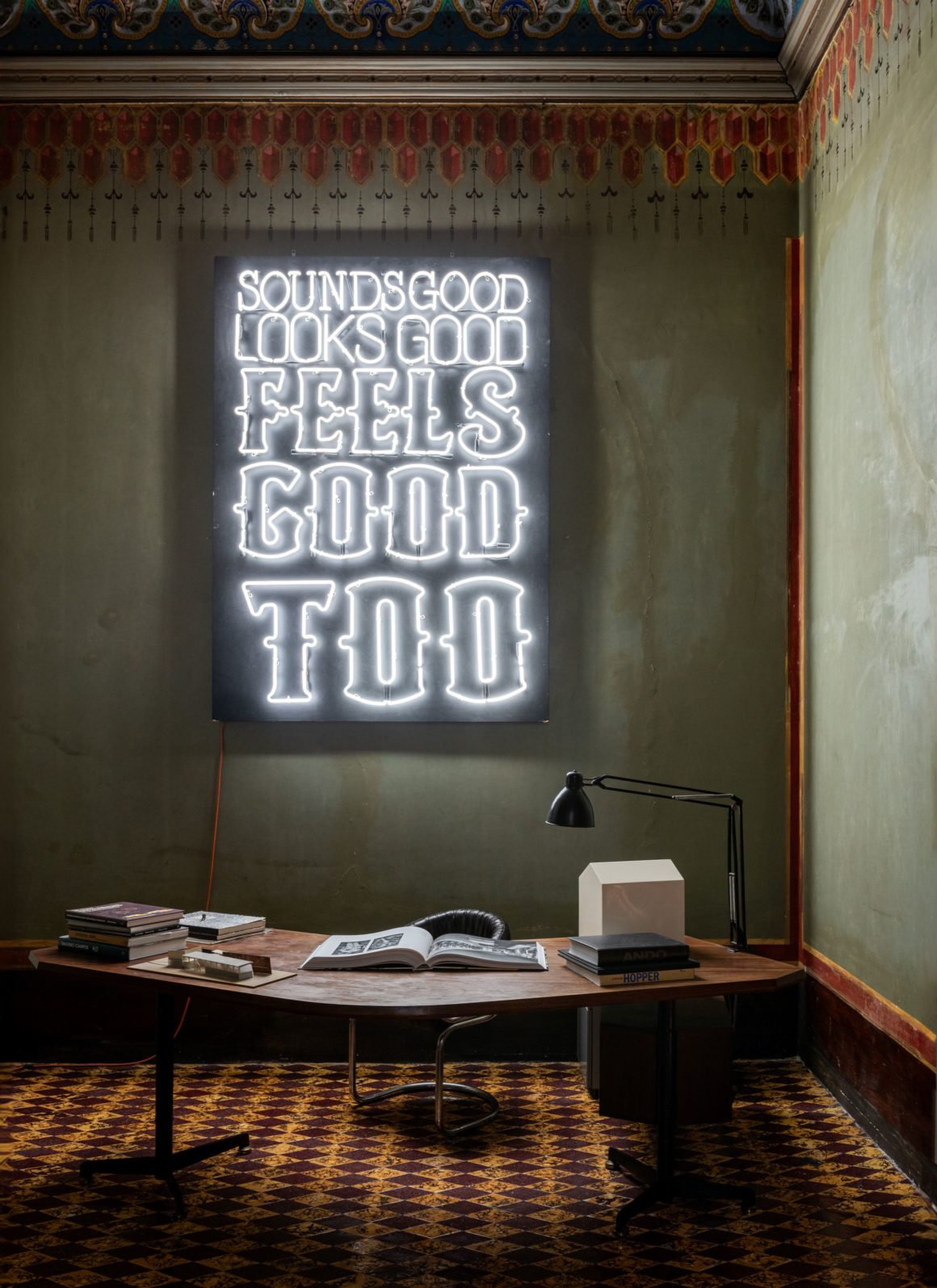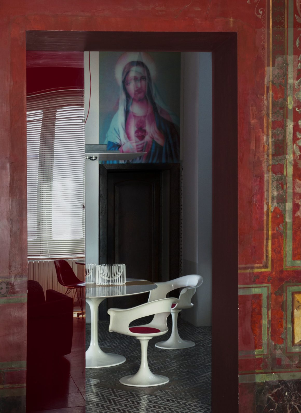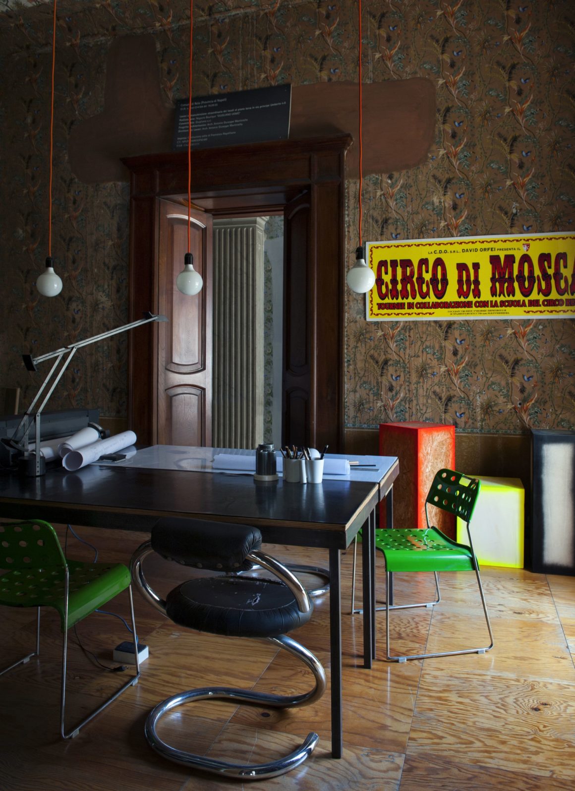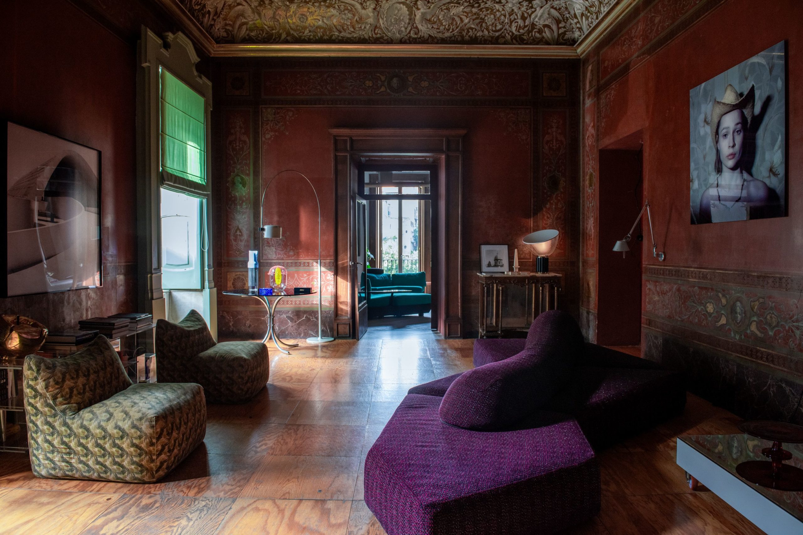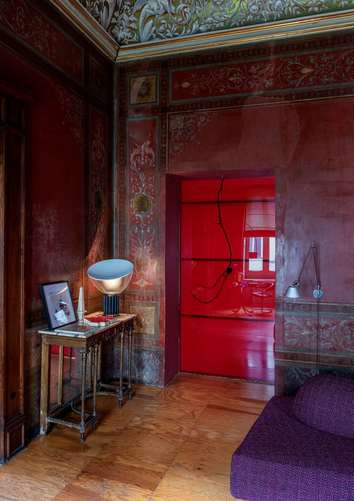 Le papier peint, détérioré et décollé par le temps, reprend vie et rayonne; les décorations orientales de la salle du paon et du papillon révèlent des histoires et des anecdotes d’un passé riche en culture. Selon la mode de l’époque, chaque pièce devait avoir une décoration spécifique, et ce qui a survécu à la patine des années restitue la subtilité des techniques anciennes du 19e siècle qui imitaient le bois ou le marbre. L’art sous toutes ses formes relie ces pièces ouvertes et communicantes : des œuvres de Harry Pearce, de Roxy Rose, Salvino Campos, Andrea Anastasio, Ryan Mendoza, Fischerspooner et Alberto Tadiello côtoient de rares pièces de mobilier d’époque comme le bureau hollandais à abattant ou le miroir en bois sculpté de l’entrée. Ici, dans une atmosphère très créative, le design explose également. Des pièces de production industrielle, d’autres délicatement ouvragées ainsi que des icônes vintage dialoguent dans un langage intemporel. L’architecture a commandé, mais dans un juste équilibre, réveillant avec délicatesse ce palais endormi.
