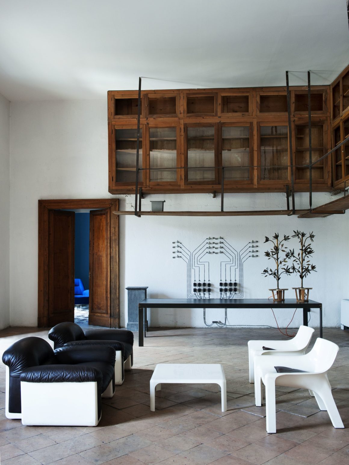 Dans le salon, canapé On the Rocks de Edra recouvert de tissu Chanel. Fauteuils Bambole de Mario Bellini pour B&B avec tissu original de 1978. Table basse conçue par l’architecte.