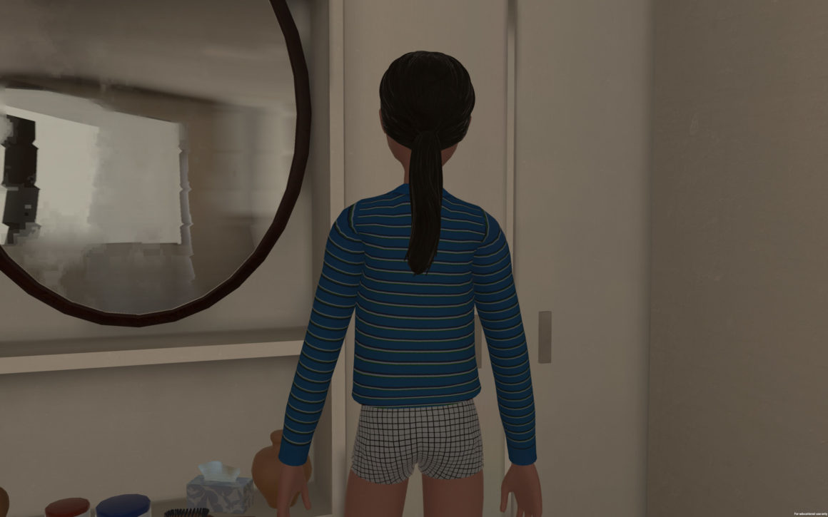 Le personnage principal, Twice, est une jeune fille modélisée à partir de l’artiste elle-même. Elle évolue dans un monde fait de boucles, d’impasses, de désorientations, où le récit n’obéit à aucun schéma classique. Il n’y a ni trajectoire imposée, ni résolution définitive : chaque action du joueur ouvre une nouvelle variation possible, comme un souvenir d’enfance rejoué à l’infini. Cette absence de narration fixe devient précisément le moteur de l’œuvre. Xenofontos propose une expérience où le présent du visiteur façonne le destin du personnage. Twice devient alors un reflet, un double mouvant des joueur·euse·s, incarnant leurs choix, leurs hésitations et leur manière d’habiter l’histoire.