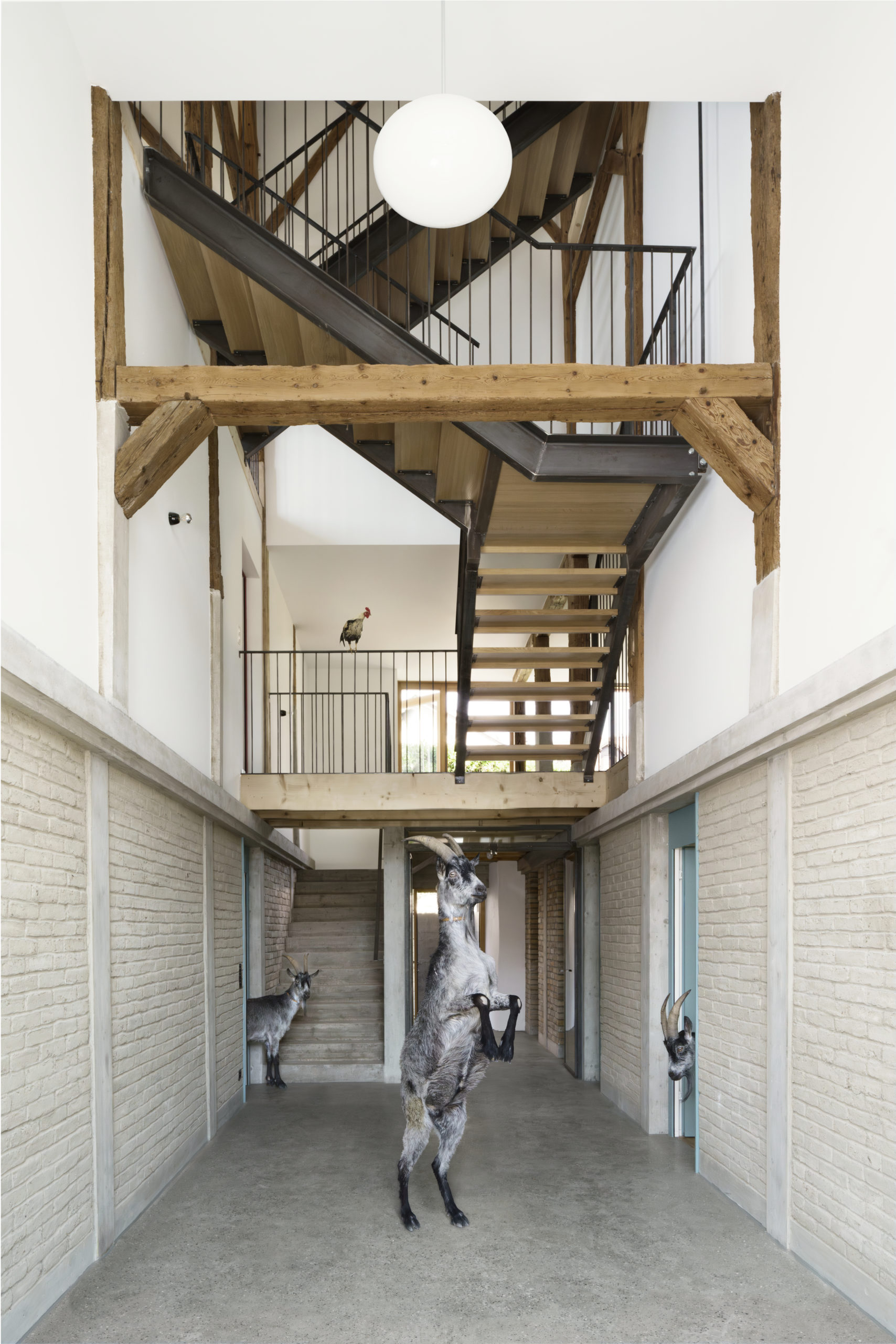 Les architectes Arthur de Buren et Charles Capré, de la Coopérative d’architecture C/O, ont proposé une intervention qui permet d’optimiser les surfaces, tout en générant convivialité et partage. Le porche de la grange, orienté en direction du jardin, donne la direction de la structure centrale, tout autant spatiale que constructive ou sociale. Les espaces privatifs s’égrènent autour des espaces communs, générés par cette percée centrale. Ce dispositif permet d’amener la lumière dans la profondeur du volume, tout en offrant facilement la perception de l’ensemble des communs.
