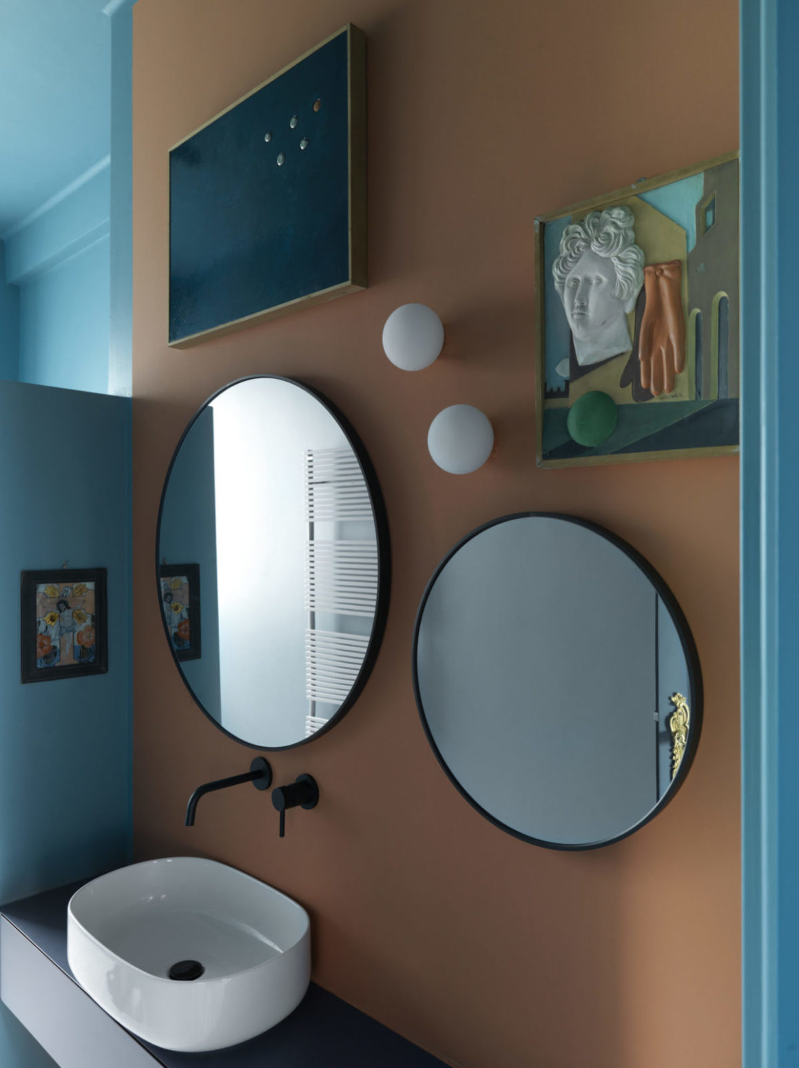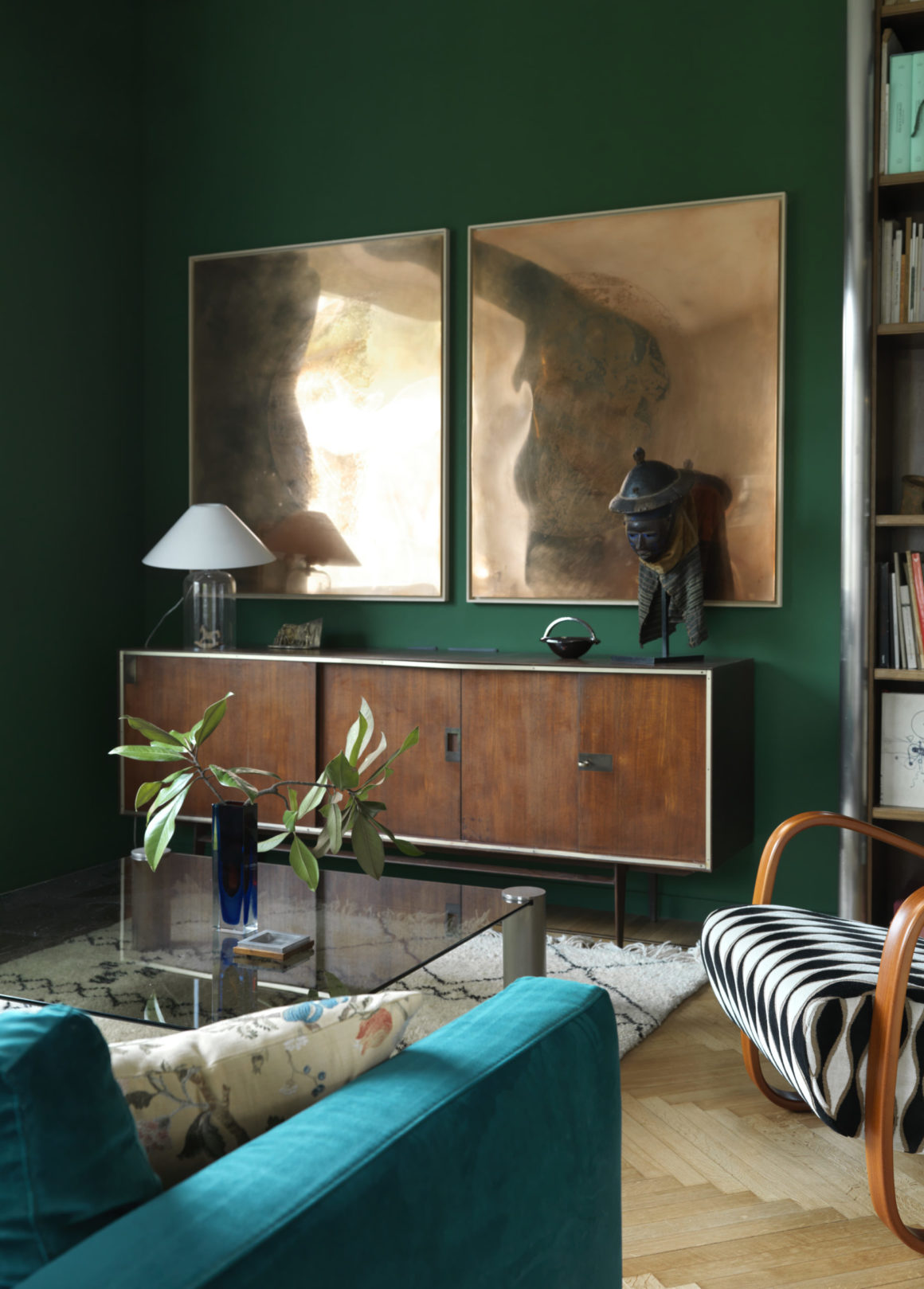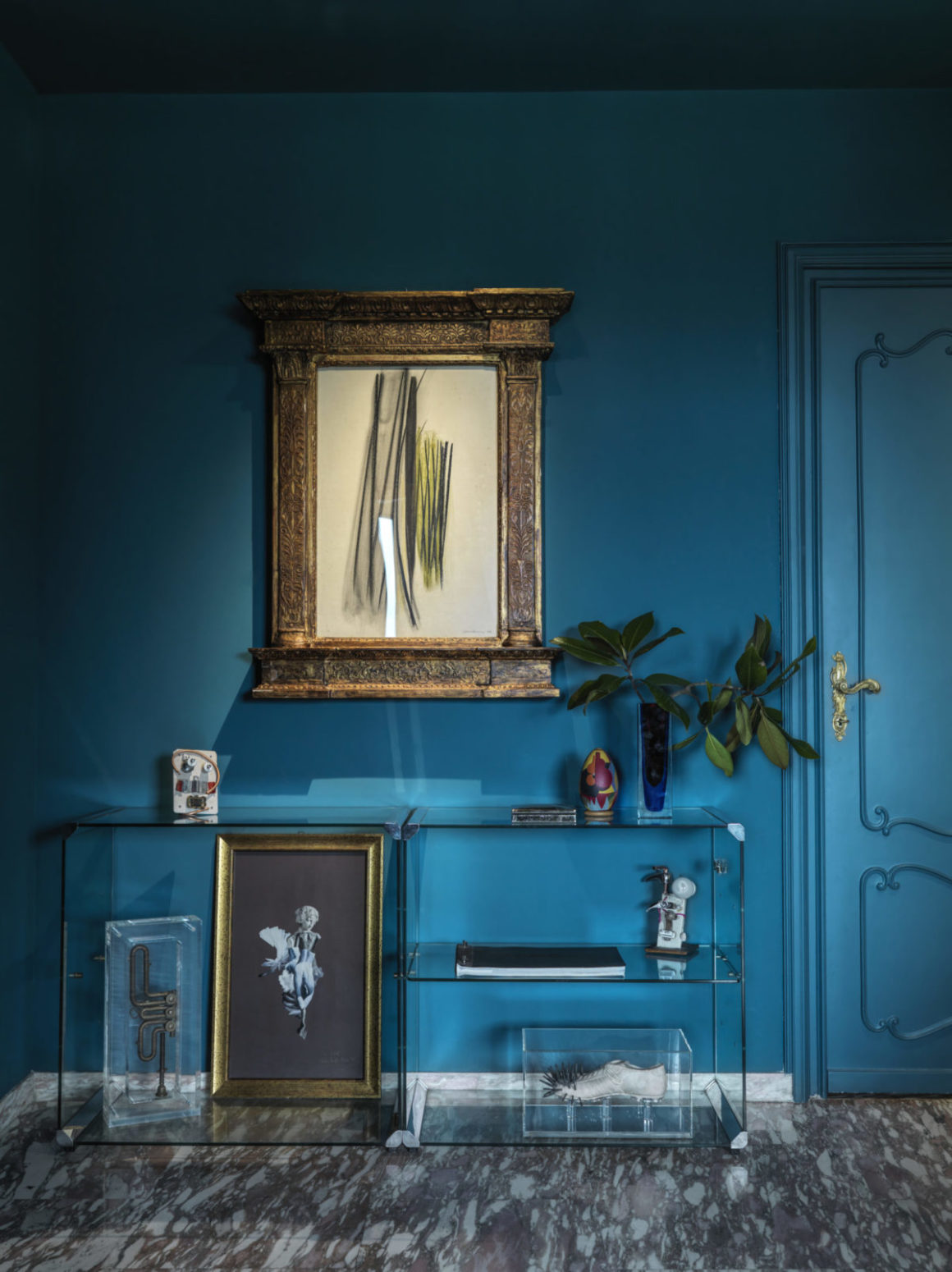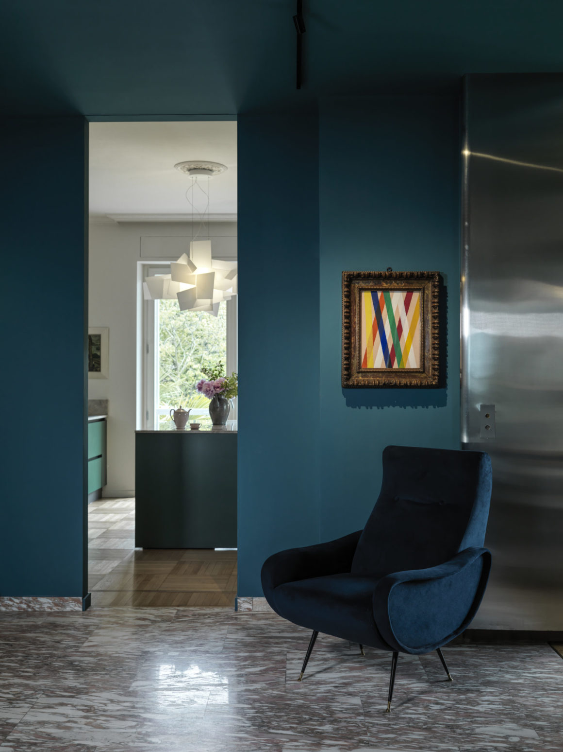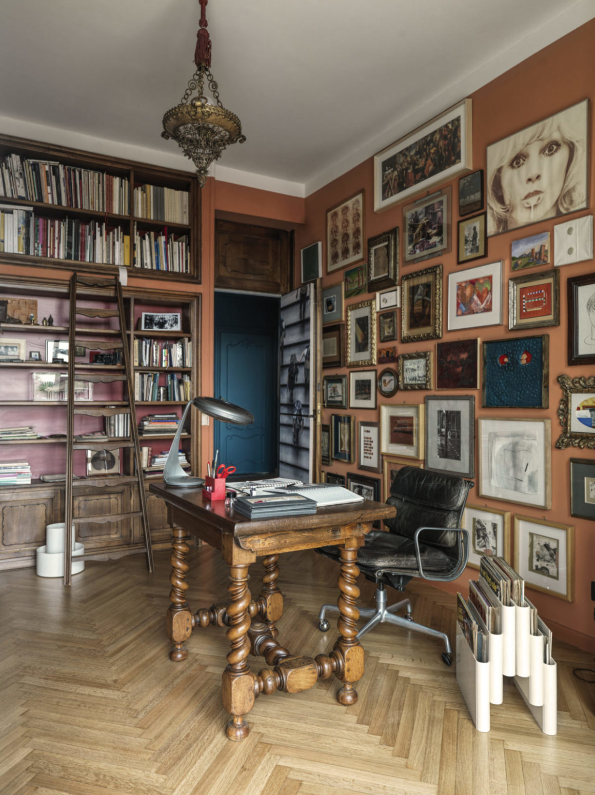 En ce qui concerne les couleurs, Max a effectué une recherche méticuleuse ne laissant que les murs de son atelier en blanc neutre, tandis que toutes les autres pièces sont animées de couleurs fortes et vibrantes. Le hall d’entrée et le couloir, qui est la véritable colonne vertébrale de la maison, est ainsi entièrement revêtu d’un bleu paon, y compris les portes de style baroque qui se fondent ainsi mieux dans le décor.