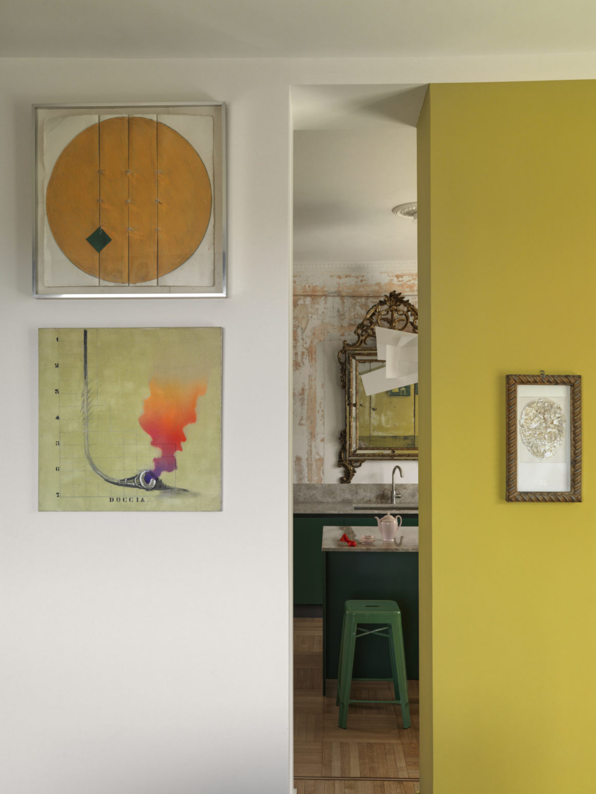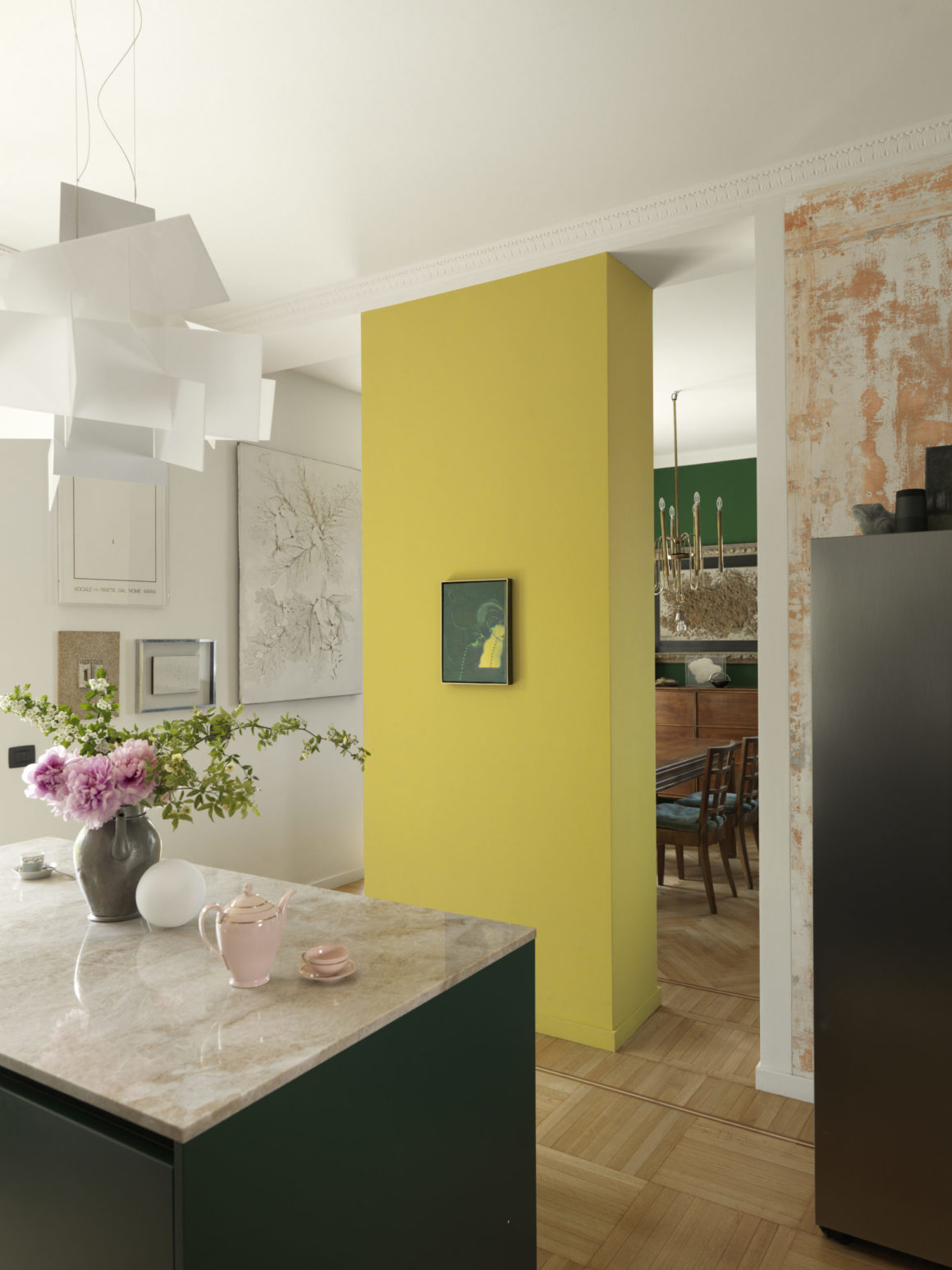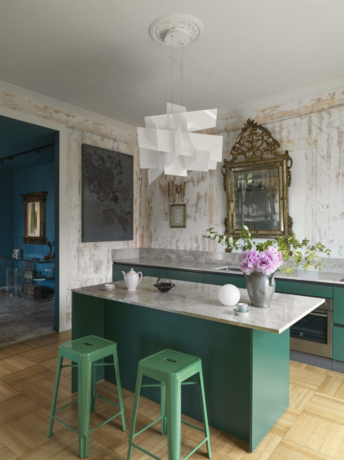 Dans cette cuisine, tous les murs ont été débarrassés de leurs papiers peints, révélant ainsi une patine qui crée une toile de fond intrigante pour une cuisine moderne. «Ici, nous voulions des murs sans placards pour créer une cuisine qui soit le prolongement de la salle à manger et du salon», explique Max. Avec son îlot de style contemporain, ses plans de travail en marbre composite, ses murs patinés, la suspension Big Bang de Foscarini et son miroir baroque, la cuisine est devenue le cœur de l’appartement et la pièce préférée du couple.