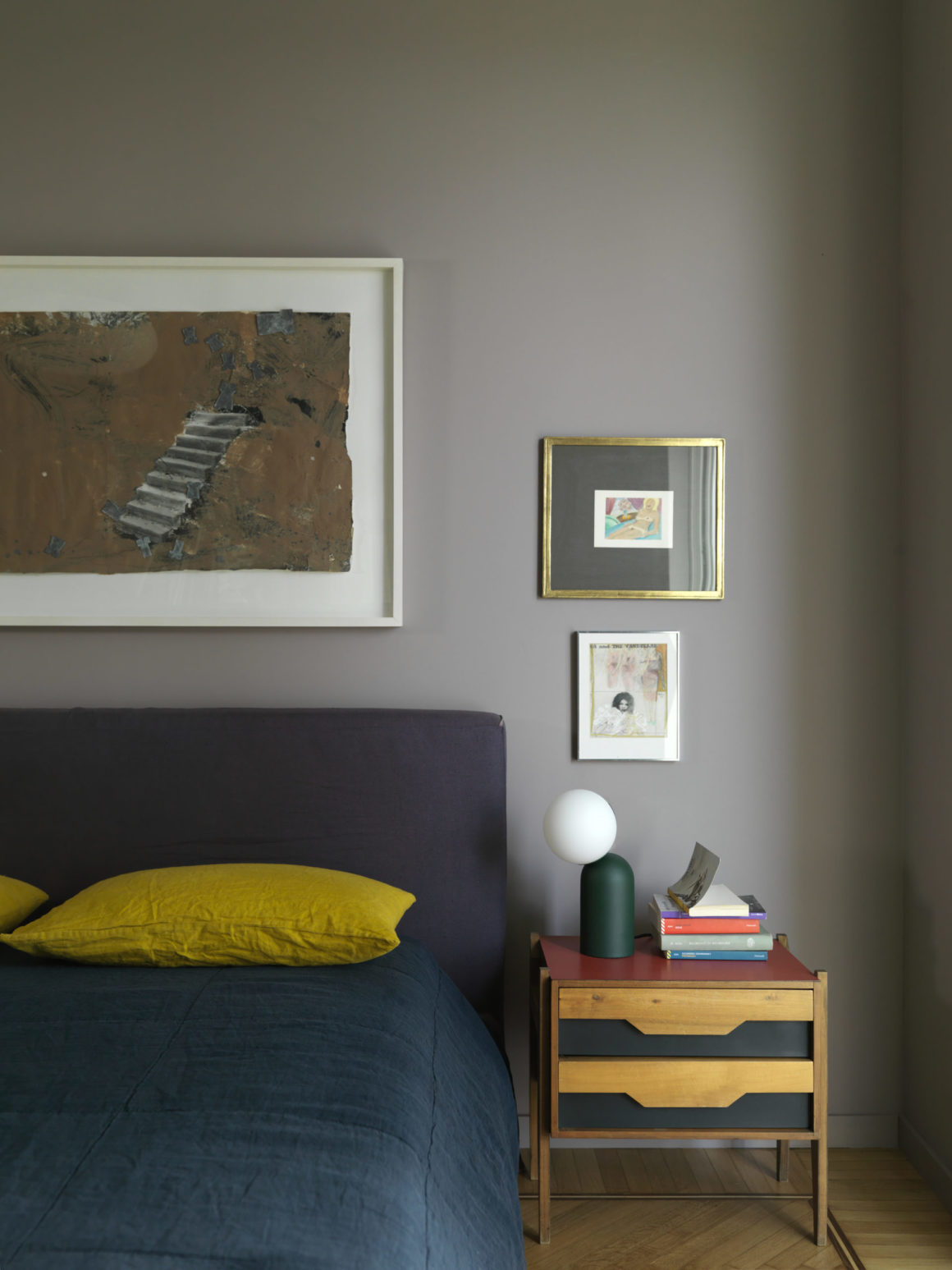 Source: © Mads Mogensen. Parution EC4/2022Le couloir est flanqué de la chambre principale et de deux chambres d’amis et de deux salles de bain. La salle de bain principale a été entièrement refaite. Ici, certains pans de murs sont colorés en bleu profond combiné à une légère teinte chaude et poudreuse de terracotta. Pour la chambre, c’est un gris taupe plus reposant qui a été choisi.