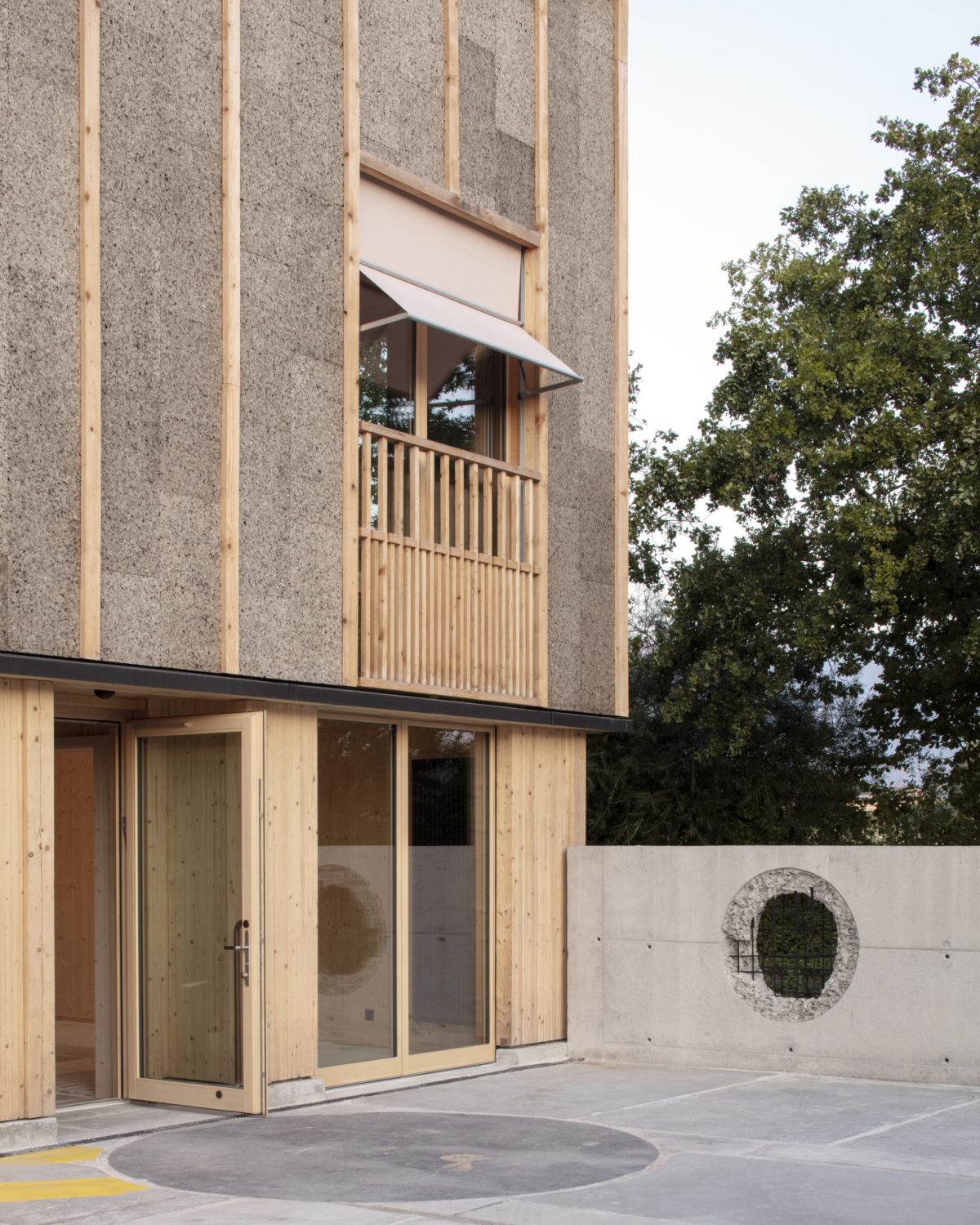 Source: © Paola Corsini. Parution CB4/2023À la demande de la Ville de Meyrin, une réflexion globale a été menée par FAZ Architectes afin de réduire l’impact environnemental du bâtiment, notamment en travaillant sur les émissions de gaz à effet de serre de l’édifice sur l’ensemble de son cycle de vie, à commencer par le sol.