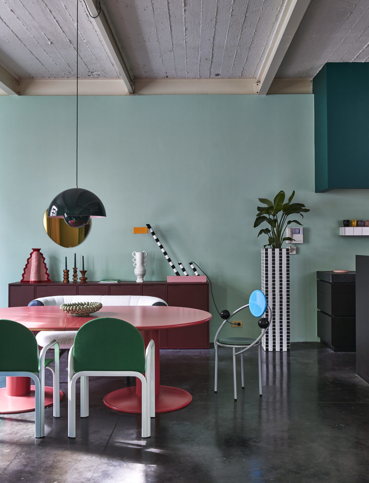 La salle à manger donne sur une cuisine, également habillée de vert et d’objets Memphis. Tabourets de bar Allmilmo des années 80′.