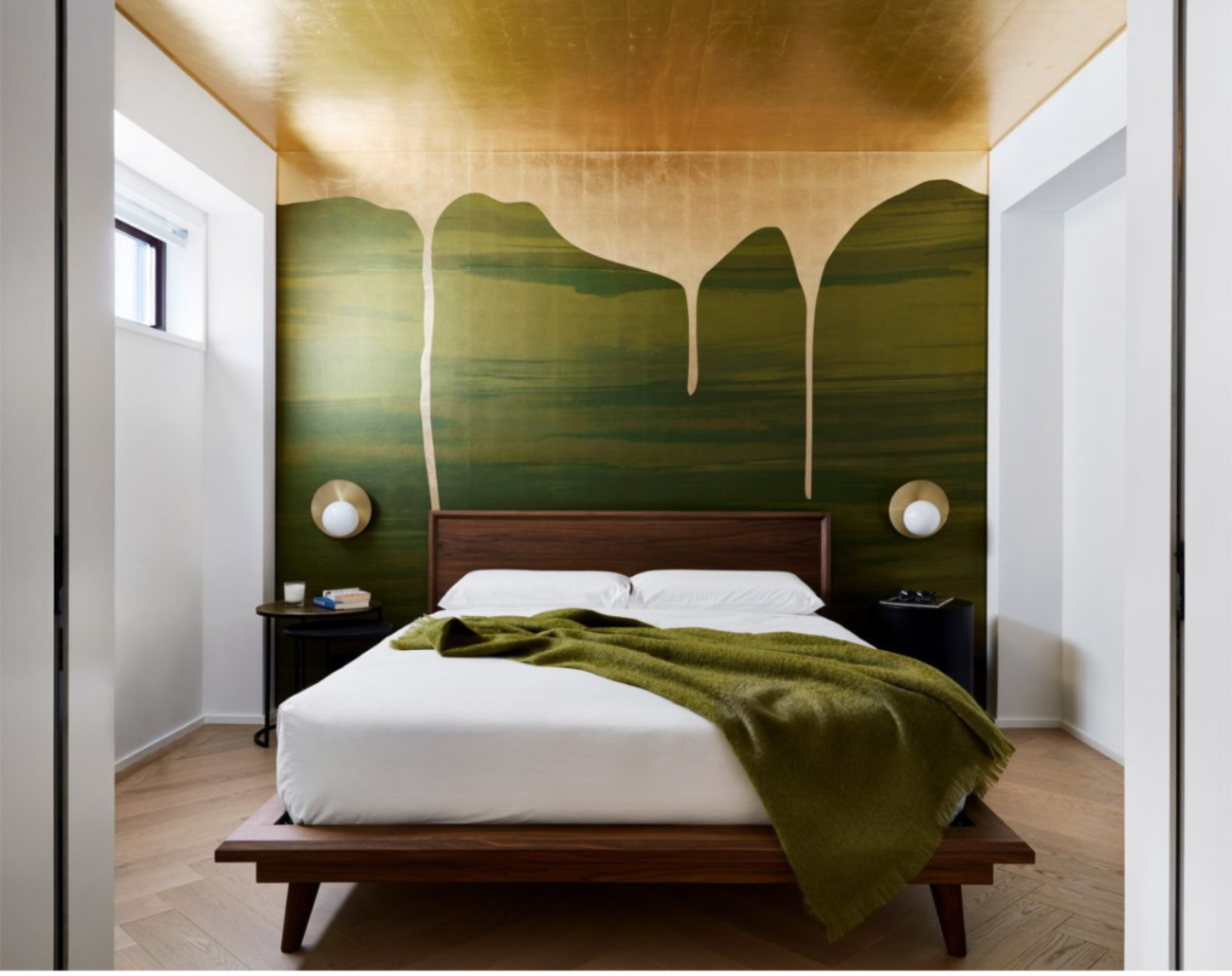 Une chambre où les verts tendres sont associées à une tête de lit en cannage. Papier peint Gucci Decor.