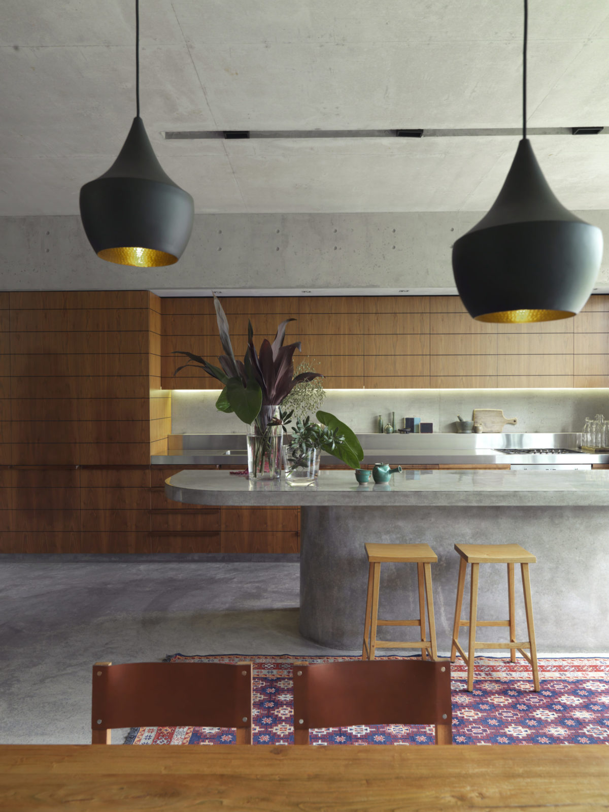 Dans la cuisine et la salle à manger, les immenses baies vitrées créent une sensation d’ouverture, permettant une liaison transparente avec le jardin et la piscine. La zone du salon située à l’avant de la maison est plus privée et isolée. Grâce à son atmosphère intime, celui-ci est surtout utilisé pendant les mois d’hiver les plus frais, où une sensation de chaleur et de confort est privilégiée