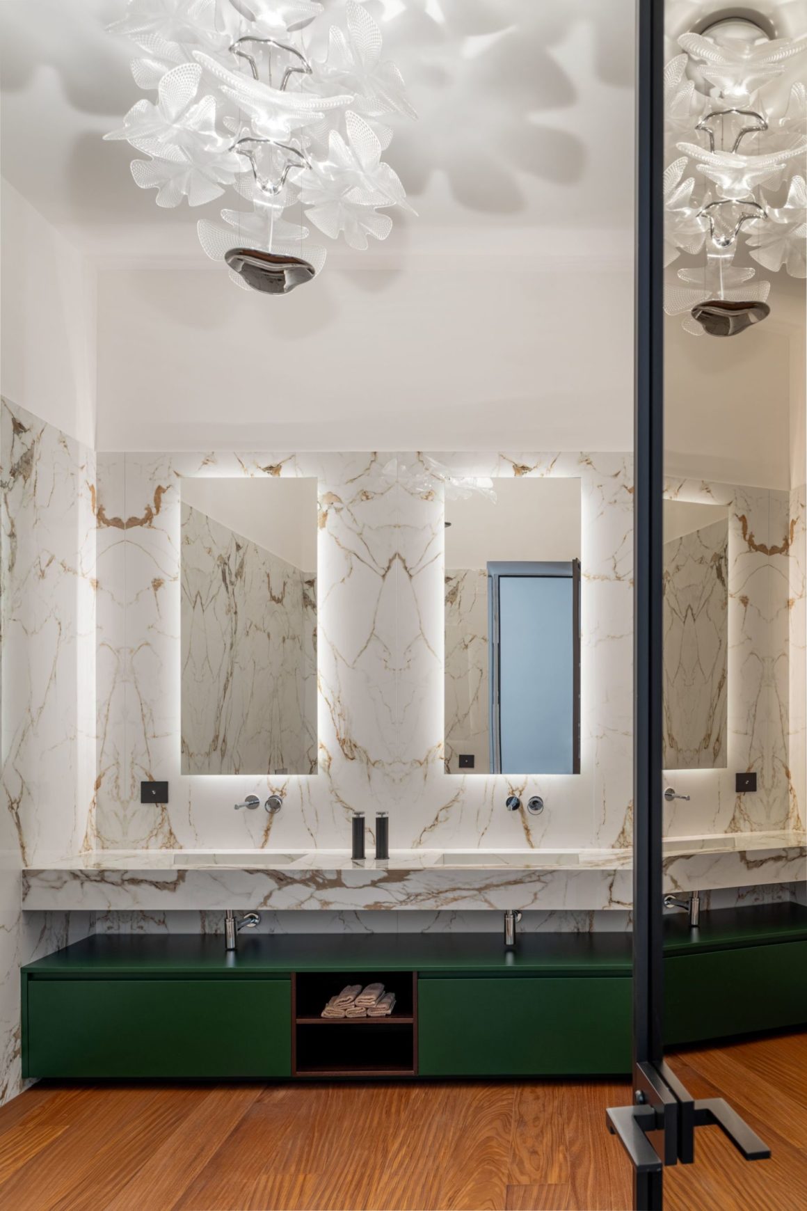 Cette idée de légèreté traverse tout le projet, jusque dans l’escalier suspendu qui remplace une structure bétonnée trop massive. Chaque marche en bois est en porte-à-faux et semble flotter dans l’espace à partir d’une plateforme rétroéclairée en guise de seuil. L’intérieur, structuré par des matériaux naturels comme le marbre, le grès cérame ou le parquet en afrormosia huilé, combine rigueur géométrique et chaleur organique. Fidèle à cette tension entre passé et modernité, le mobilier signé Edra, aux lignes sculpturales, contraste avec la sobriété architecturale pour composer un cadre élégant, raffiné, profondément ancré dans son temps.