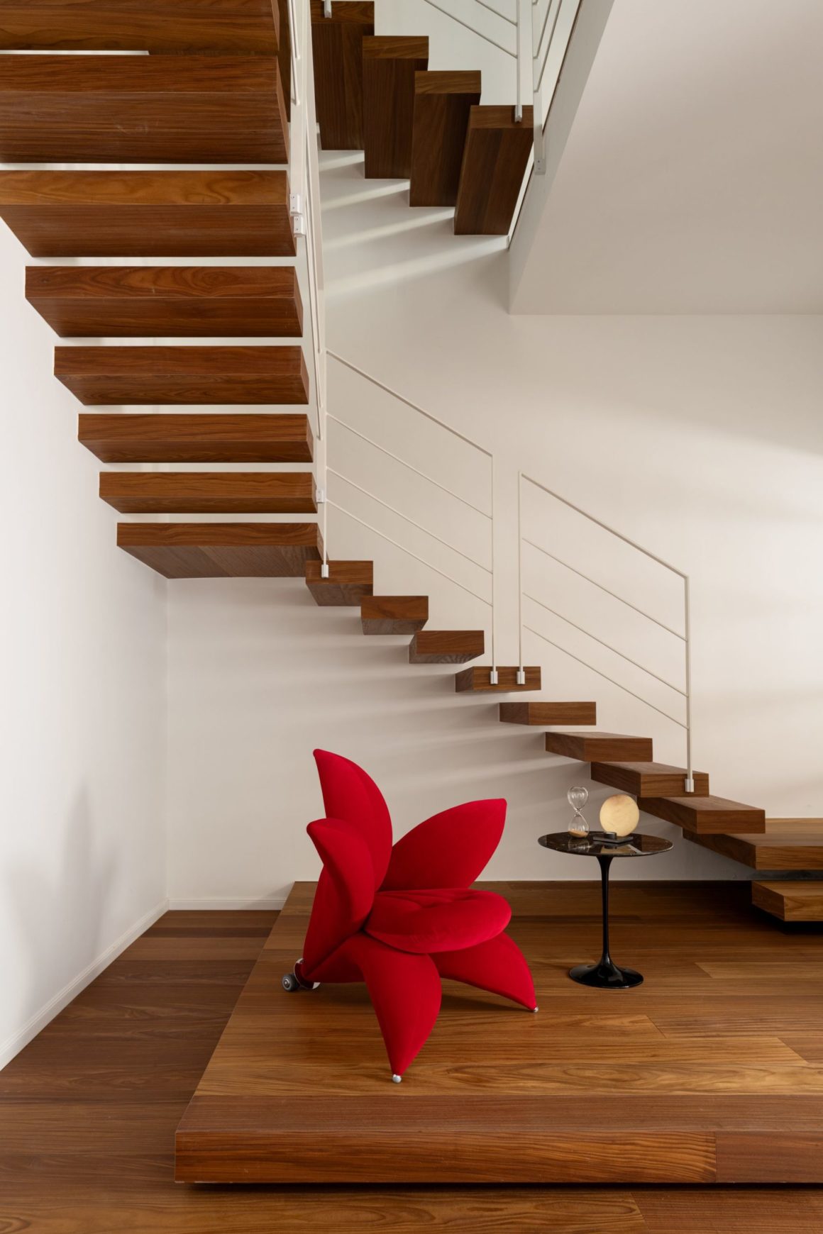 Devant l’escalier, le fauteuil Getsuen rouge d’Edra.