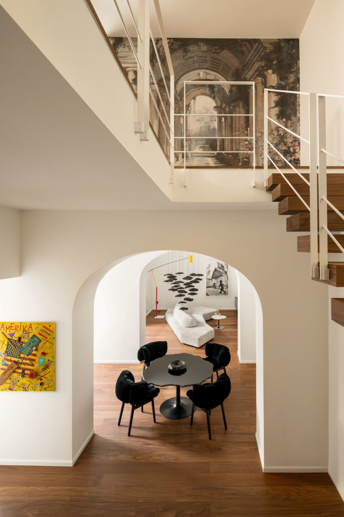 Les œuvres de Bruno Donzelli et les photographies de Francesco d’Alessandro ponctuent les murs. La blancheur des volumes, volontairement dominante, agit comme un révélateur : ici, le mobilier devient l’acteur principal et chaque pièce, savamment mise en scène, compose une atmosphère à la fois élégante, sereine et profondément contemporaine.