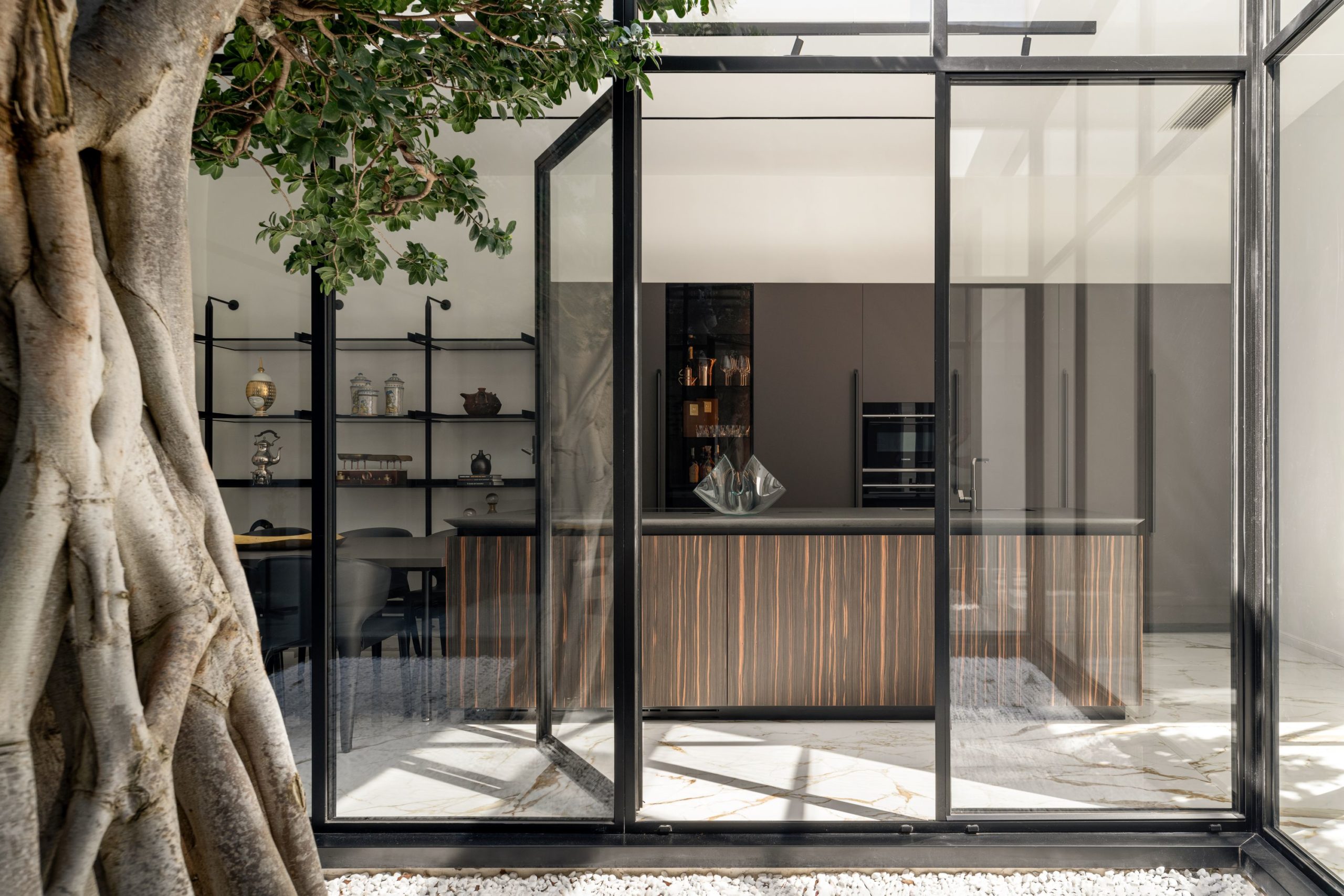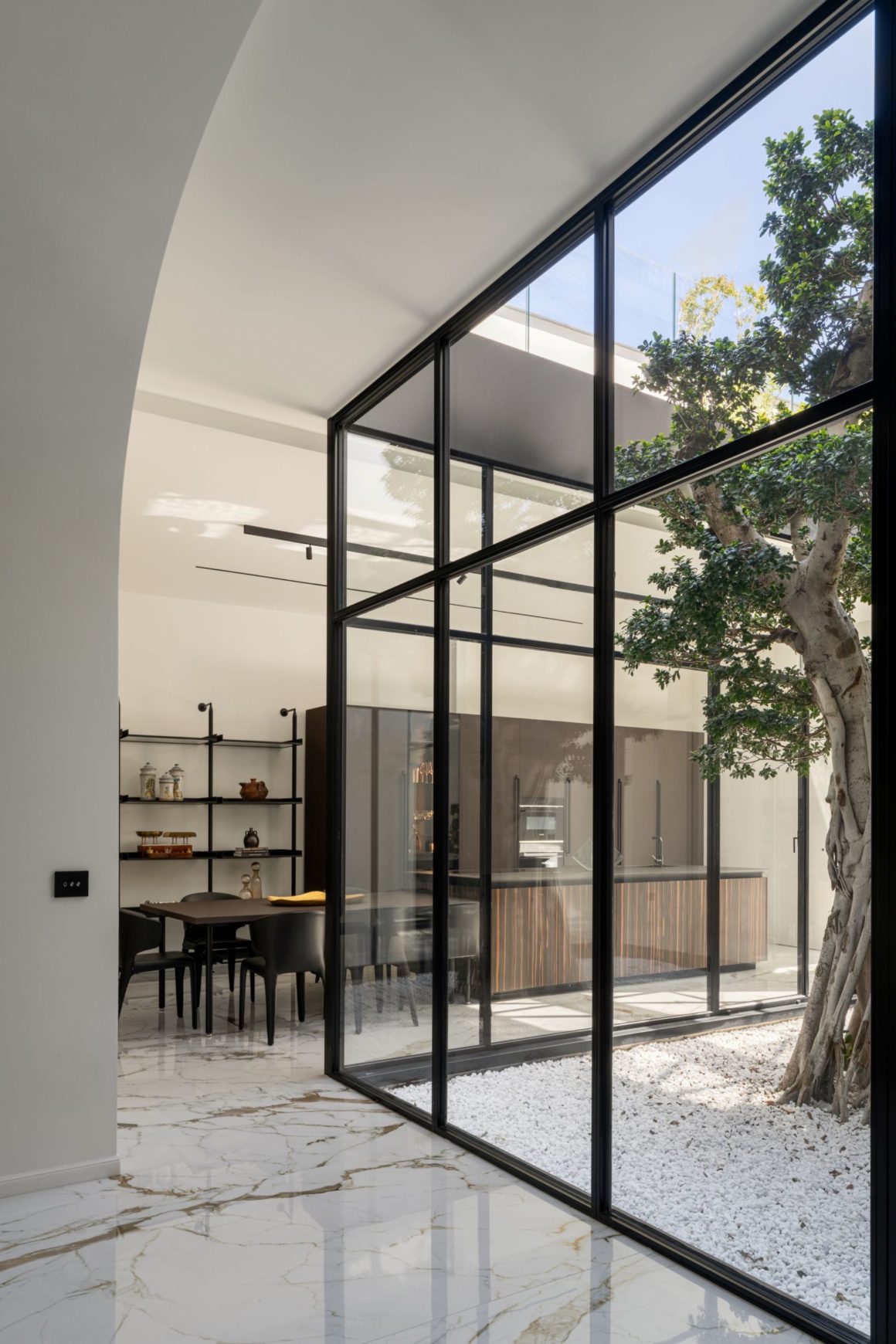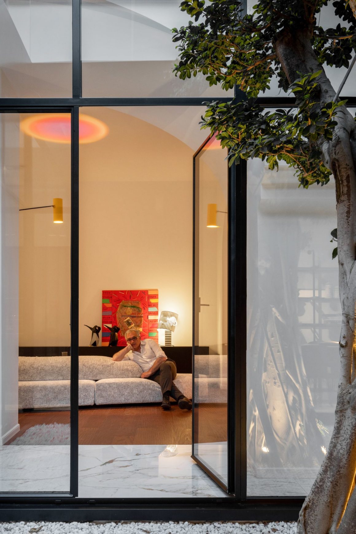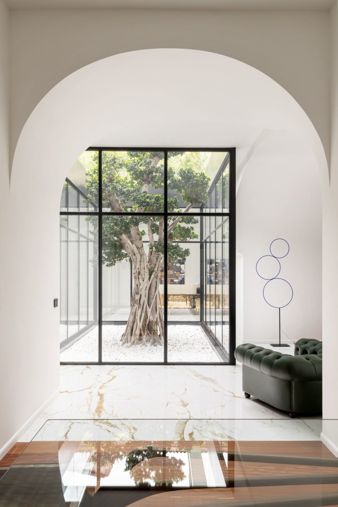 Au nord de Naples, l’architecte Antonio Zagaria insuffle une nouvelle identité à une maison tout en conservant sa substance historique. Située à quelques pas de la cathédrale d’Aversa et du centre commerçant, elle renaît autour d’un espace inattendu : une cour intérieure végétalisée, véritable cœur du projet. Installée dans un bâtiment de la fin du 19e siècle, elle a été entièrement repensée pour rétablir une circulation fluide et cohérente, là où les rénovations passées avaient morcelé les volumes. Le point central ? Un majestueux Ficus Benjamina, aux racines séculaires, mis en scène dans une structure en verre et métal qui inonde l’intérieur de lumière. Autour de cette oasis s’articulent les pièces de vie, pensées dans une continuité élégante, où chaque meuble et chaque matériau participent à une atmosphère aussi raffinée qu’intemporelle.